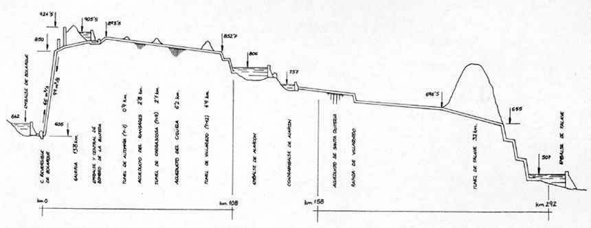 Cuando se emprendió el Trasvase Tajo Segura se decidió ubicar la toma en Bolarque y construir desde allí una elevación de 300 m hasta el nuevo embalse de La Bujeda, de donde partía la conducción rodada. El trasvase se estructuró en tres grupos de obras: